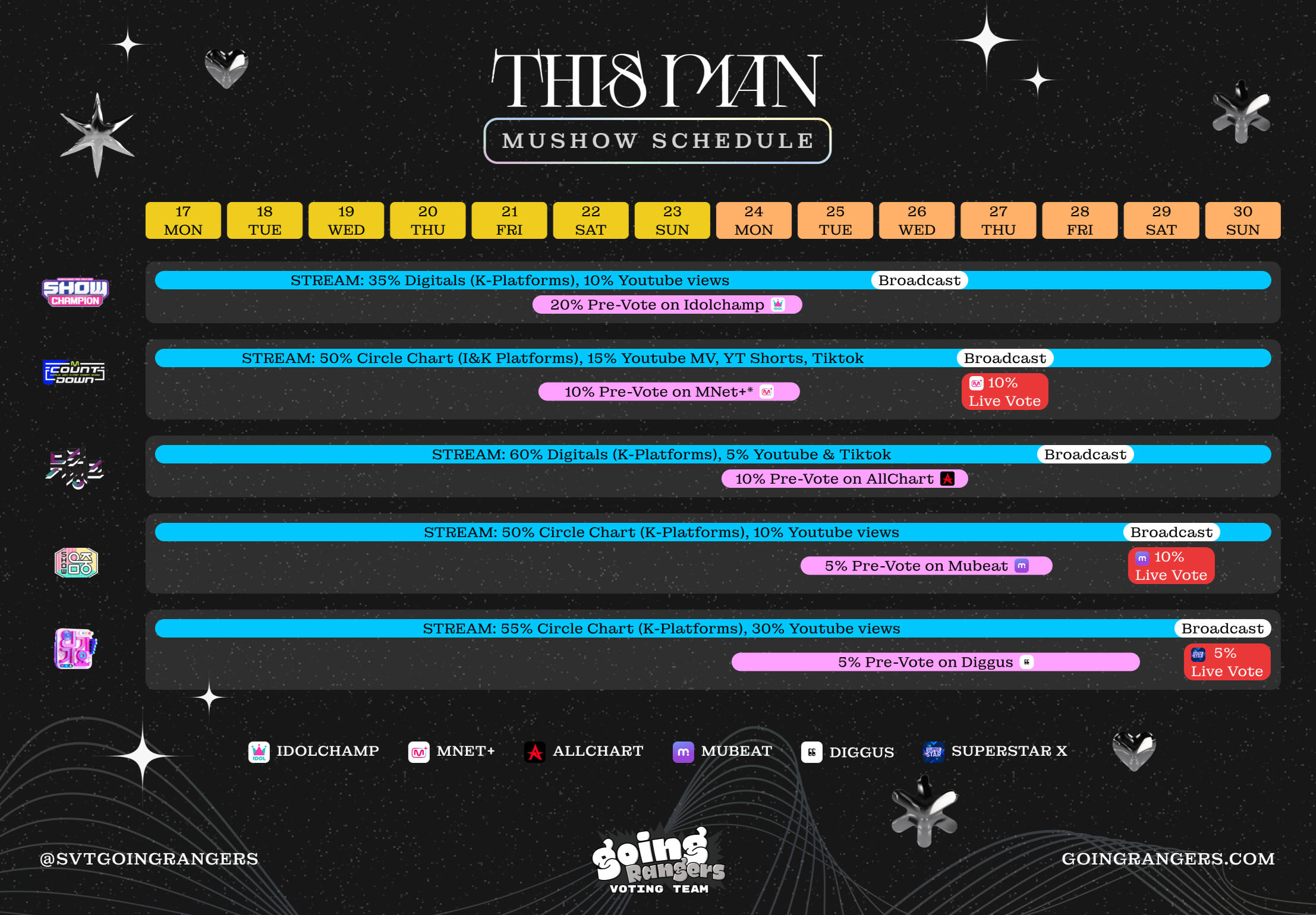 Manual Stream on Youtube for the first 24 hours. It is best to manual stream for the whole tracking week but if it is not possible, you may use playlists after 24 hours. Like/Comment/Share on Youtube and Like/Share on Spotify.